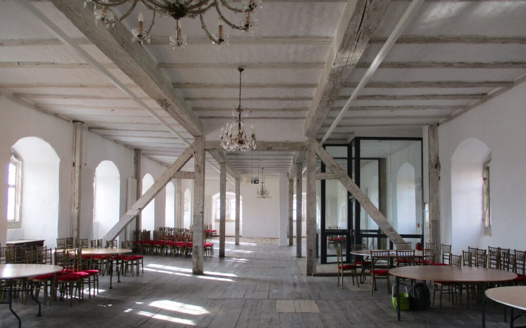 Nach vier Jahren Bauzeit wurde der erste Bauabschnitt – das sogenannte Kornhaus – als Büro- und Beherbergungsbereich mit wiederhergerichtetem Festsaal erfolgreich abgeschlossen. Der Rückbau späterer Einbauten ließ Raumgefüge und Farbwirkung der Renaissance erneut erstrahlen. Aufwendige brandschutztechnische Vorgaben wurden mit großem Feingefühl umgesetzt, etwa durch die Ertüchtigung des historischen Treppenhauses mit gläsernem Raumabschluss oder anspruchsvolle Türlösungen.