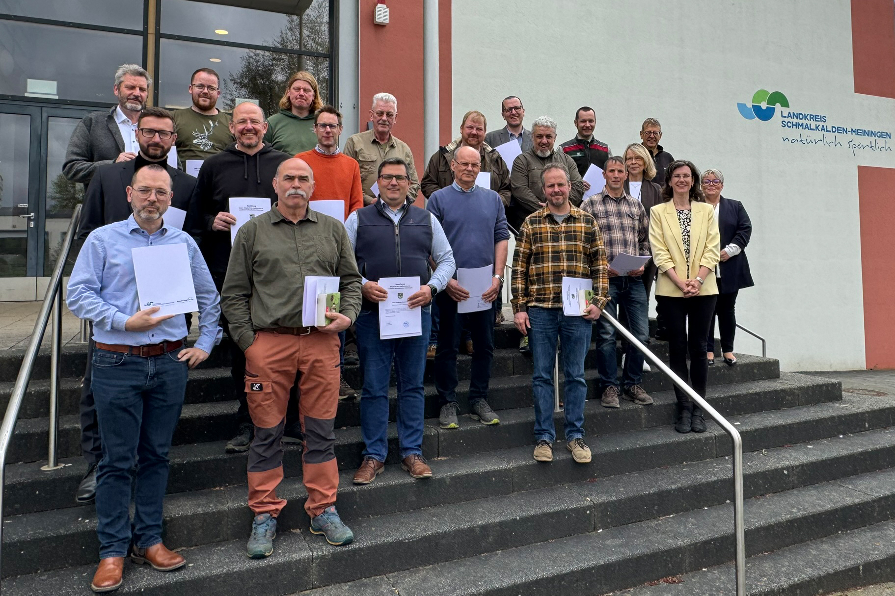 Der Jagdbeirat des Landkreises Schmalkalden-Meiningen startet in eine neue Amtszeit: Am 20. April 2026 wurden im Saal des Meininger Landratsamtes die ehrenamtlichen Mitglieder für die Periode 2026 bis 2031 offiziell berufen. Die 1. hauptamtliche Beigeordnete Susanne Reich überreichte gemeinsam mit Mike Bauroth, dem Leiter des Fachdienstes Ordnung und Straßenverkehr, dem auch die Untere Jagdbehörde angehört, die Berufungsurkunden. Letzterer hat gleichzeitig den Vorsitz des Jagdbeirates inne.