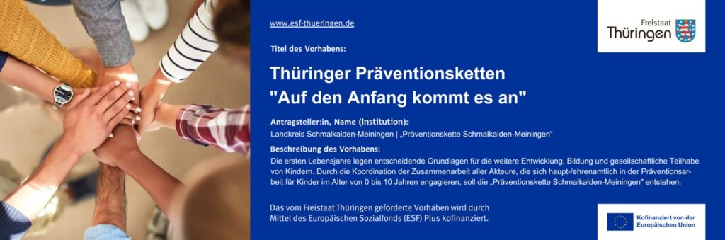 In den ersten Lebensjahren werden entscheidende Grundlagen für die weitere Entwicklung von Kindern, ihren Bildungserfolg sowie ihre spätere gesellschaftliche Teilhabe gelegt. Durch die koordinierte Zusammenarbeit aller Akteure, die sich haupt- und ehrenamtlich in der Präventionsarbeit für Kinder im Alter von 0 bis 10 Jahren engagieren, entsteht die „Präventionskette Schmalkalden-Meiningen“.