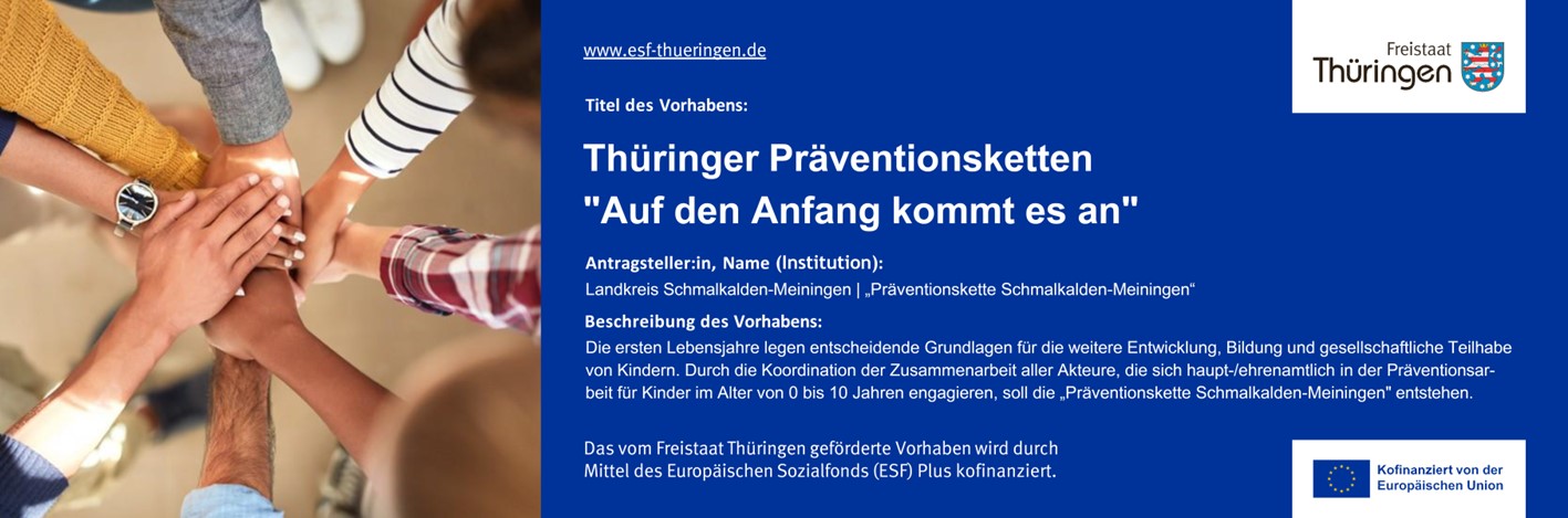 Das vom Freistaat Thüringen geförderte Vorhaben „Thüringer Präventionsketten“ wird durch Mittel des Europäischen Sozialfonds (ESF) Plus kofinanziert.
